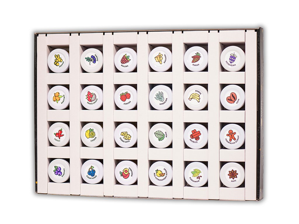 Anýz, Arónie, Banán, Borůvka, Citrón, Černý rybíz, Česnek, Dračí ovoce, Chilli, Jahoda, Kakao, Karamel, Kardamon, Káva, Malina, Máta, Meruňky, Mix citrus koření, Ostružiny, Perníkové koření, Rakytník, Skořice, Spirulina, Zázvor