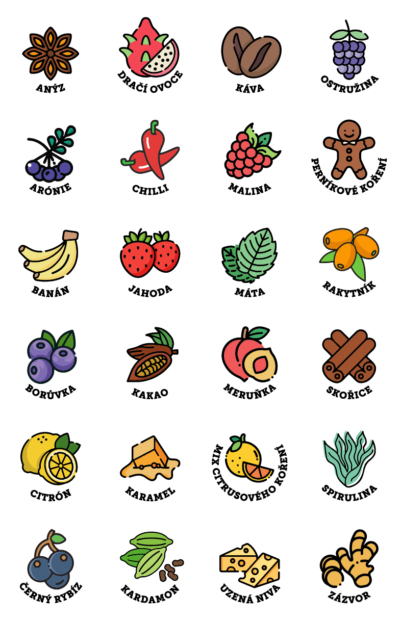 Anýz, Arónie, Banán, Borůvka, Citrón, Černý rybíz, Česnek, Dračí ovoce, Chilli, Jahoda, Kakao, Karamel, Kardamon, Káva, Malina, Máta, Meruňky, Mix citrus koření, Ostružiny, Perníkové koření, Rakytník, Skořice, Spirulina, Zázvor