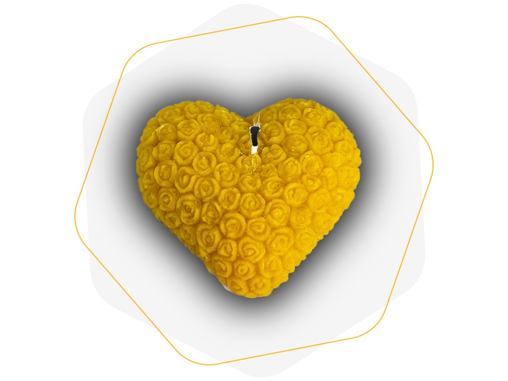 Svíčka ve tvaru srdce vyplněného drobnými růžičkami z včelího vosku – decentní dekorace plná jemnosti.